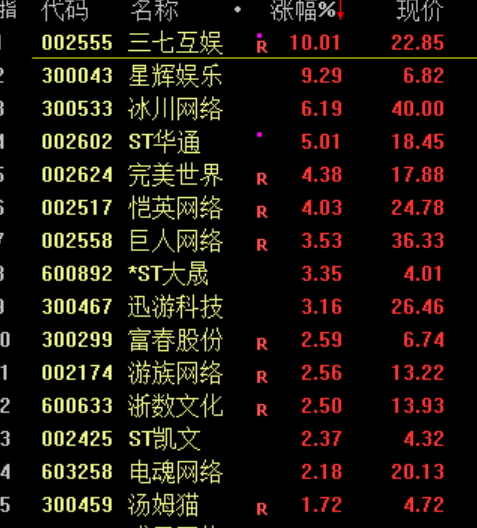 游戏板块走强,三七互娱(维权)涨停,星辉娱乐、冰川网络、昆仑万维(维权)、完美世界、恺英网络涨幅居前。
